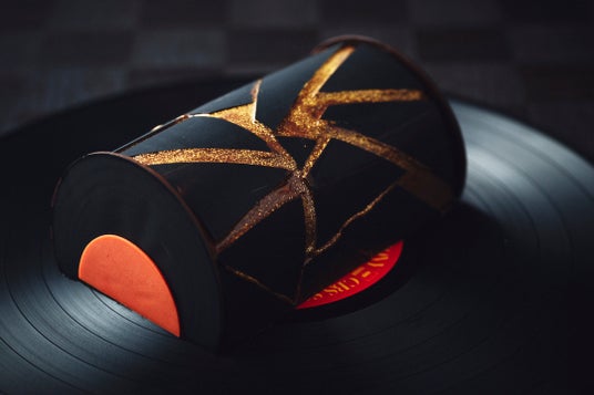 ブラックとゴールドをベースに、リッチなチョコレートで包みました。フランボワーズの爽やかな酸味とピスタチオのコク深い味わいが絶妙にマッチし、砂糖控えめながらもリッチなテイストに。渋谷のレコード文化にインスパイアされたチョコレート製のレコードデコレーションが目を引きます。