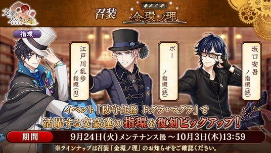 召装『金環ノ理』のラインナップを更新いたしました。この召装では、イベント『防守任務「ドグラ・マグラ」』で活躍する「江戸川乱歩」「坂口安吾」「ポー」の指環を一定の確率で入手できます。