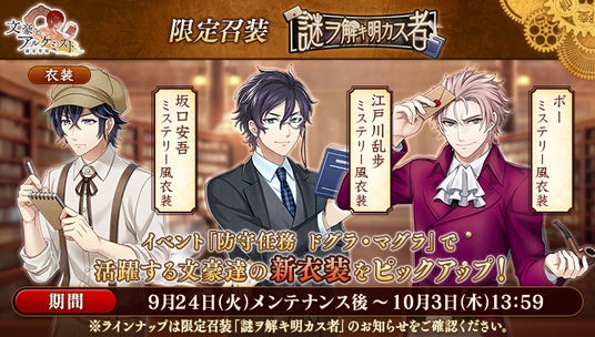文豪の「衣装」や、会派に装備する事で能力を強化できる「装像」などが入手できるコンテンツ「召装」に、限定召装『謎ヲ解キ明カス者』が期間限定で登場します。この召装では、イベント『防守任務「ドグラ・マグラ」』で活躍する「江戸川乱歩」「坂口安吾」「ポー」の新衣装を一定の確率で入手できます。