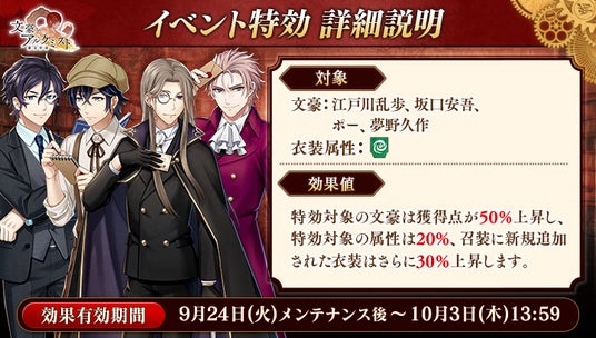 期間中「江戸川乱歩」「坂口安吾」「ポー」「夢野久作」の衣装を編成して潜書すると、得点の獲得数がそれぞれ50%上昇します。また、「風」属性の衣装を編成して潜書すると、得点の獲得数がそれぞれ20%上昇します。