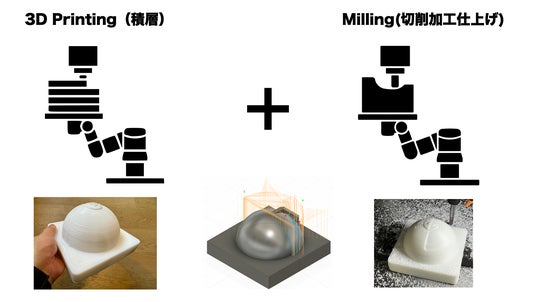 3Dプリント後に切削加工仕上げをした例(切削加工ユニットは現在開発中)