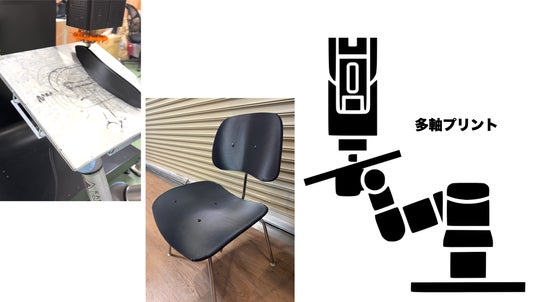 協働ロボットにビルドテーブルを持たせた「BUTLER(バトラー)」方式の特徴を活かし、多軸制御によるプリンティングも可能です。多軸制御を活かした椅子のサンプルなどをご覧いただけます。