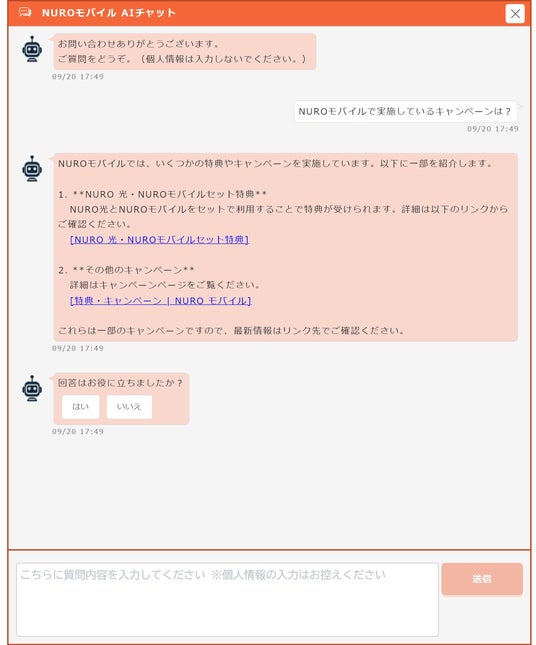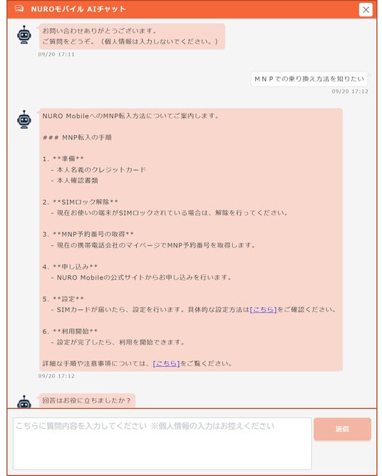 また、従来のサポート対象は「NUROモバイル」の契約者のみでしたが、対象を拡大し、「NUROモバイル」の申し込みを検討している方の質問にも回答できるようになります。MNPでの乗り換え方法や最新の特典・キャンペーンに関する情報を、チャットで質問するだけですぐに取得することができます。