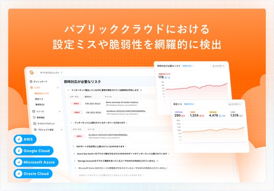 「Cloudbase」は、AWS・Microsoft Azure・Google Cloudといったパブリッククラウドを利用する際に発生する設定ミスや、サーバーやコンテナの脆弱性といった様々なクラウド上のリスクを、統合的に可視化し、対策項目の優先順位付けと実施・管理までを一貫して行うセキュリティプラットフォームです。