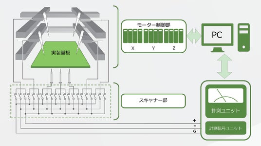 フライングプローブテスタフライングプローブテスタは、複数のプローブが基板上の任意のポイントに移動しながらインサーキット検査(ICT)を行う装置です。特別な治具が不要で、検査プログラムの入れ替えだけで段取り替えが可能なため、多品種・少量生産基板のアナログ回路・電源回路の検査に適しています。