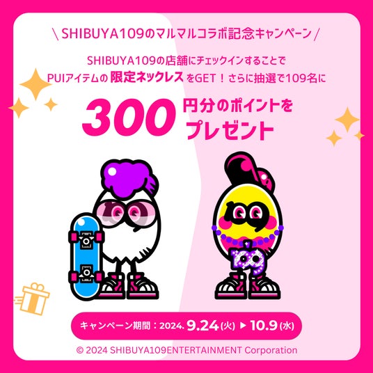 コラボリリースを記念し、アプリ上のミッションである「SHIBUYA109の各施設へ来店する(GPSにて判定)」をクリアすると、「PUI」の限定アクセサリーアイテムがもらえるキャンペーンを実施いたします。さらに、アイテムをゲットされた方の中から抽選で109名様に、「PUI」で使えるポイントを3,300ポイント(300円相当)プレゼントいたします。