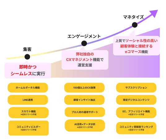 ユーザーの行動を科学しデータ分析でコミュニティ運営課題を可視化。さまざまな機能を活用してCXマネジメントを支援することで顧客とのエンゲージメントを高め、マネタイズ効率を最大化します。