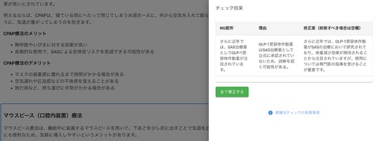 そこで、薬機法&医療広告ガイドラインに準拠した記事作成をより安全かつ確実にサポートするために、「薬機法&医療広告ガイドラインチェックAI」の開発に至りました。