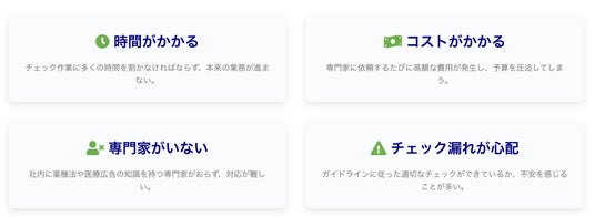 薬機法や医療広告ガイドラインは非常に細かく規定されており、すべての内容が基準に合致しているかを確認するには多くの時間を要します。特に医療関連の内容では、法律やガイドラインの変動も考慮する必要があり、チェック作業は非常に煩雑です。