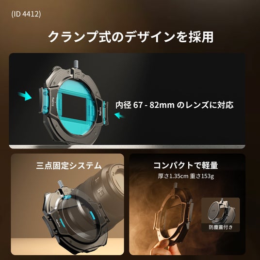 コンパクトで軽量なクランプ式アダプターは、内径67mm~82mmのレンズに対応しており、三点でしっかりとレンズに固定します。マグネットでフィルターをワンタッチで取り付けることができます。