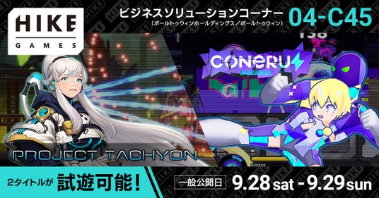 株式会社HIKEのゲームレーベル「HIKE GAMES」は、東京ゲームショウ2024(以下「TGS2024」)の一般公開日(9月28日、9月29日)において、「ポールトゥウィンホールディングス/ポールトゥウィン」ブース内に今冬リリース予定の2作品の試遊コーナーを設置します。ブースではSTUDIO N9開発のラン&ガンアクションシューティング『PROJECT TACHYON』と、次元少女・亜空間こねるの2Dアクション“デート”『CONERU -DIMENSION GIRL-』の体験版をプレイしていただけます。