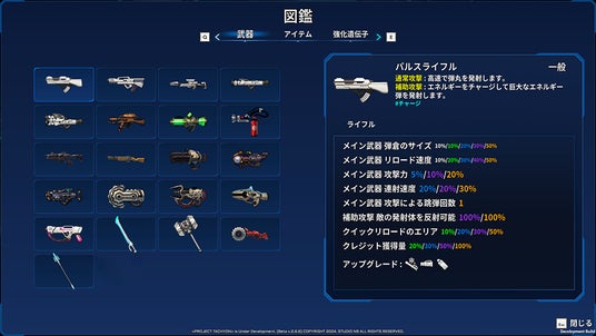 『PROJECT TACHYON』には20種類以上の武器、60種類以上のアイテムが存在し、シーンや敵に応じて使い分けることが重要になってきます。画像の武器「パルスライフル」は初期装備の弾丸を高速射出する武器で、ビルド強化により多数の弾丸を同時に発射して全方位の的を攻撃することもできるようになります。