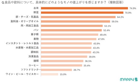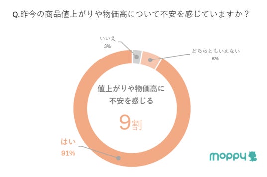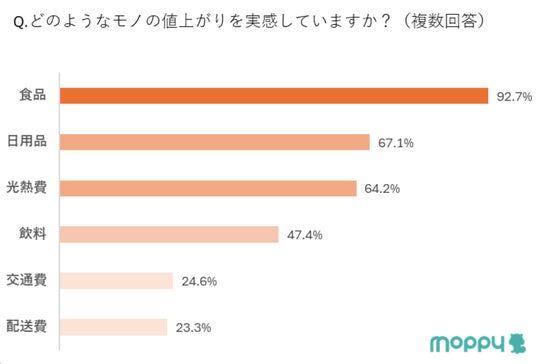 このような状況下、カウシェ、WED、セレスの3社は、ポイントサイト「モッピー」を活用して、2024年9月21日(土)~2024年9月23日(月)の期間中、2709名の方を対象に物価高騰に関する調査を実施しました。調査の結果、9割以上の方が「値上がりや物価高に不安を感じる」と回答し、また「値上げを実感をするもの」としては「食品(92.7%)」、「日用品(67.1%)」、「光熱費(64.2%)」を選択される方が多く、具体的な値上がりを感じるモノとしては「お米(74.9%)」、「野菜(70.9%)」が上位にあがりました。