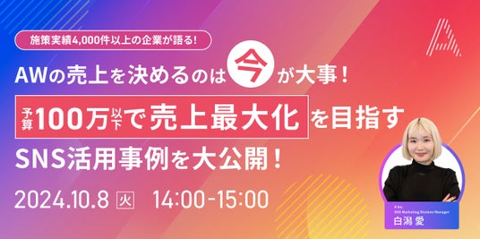 株式会社A(https://acetokyo.com/)は、「即施策実績4,000件以上の企業が語る!~AWの売上を決めるのは”今”が大事~予算100万以下で売上最大化を目指すSNS活用事例を大公開!」と題した無料ウェビナーを10月8日(火)にオンラインで開催します。