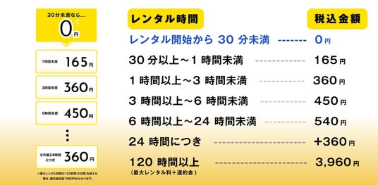 レンタル開始から30分以内はレンタル料金は0円と業界最安値※の料金設定の為、ご利用者様にも手に取りやすくなっております。※株式会社NEGG調べ2024年7月時点