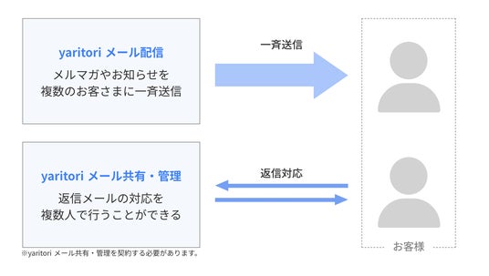 「yaritori メール共有・管理」と併せてご利用いただくことで、メルマガやお知らせをお客様に一斉配信した後、お客様からの返信メールに複数人で効率的に対応するといった運用も可能となります。