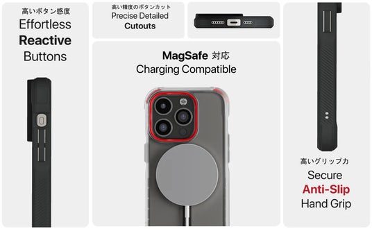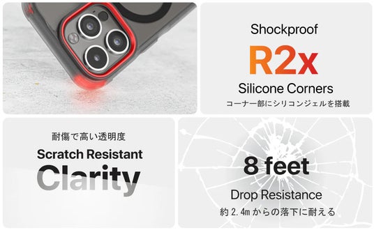 シンプルなクリアケースに耐衝撃性能とMagSafeリングをアドオンシンプルなクリアケースでありながらも、エッジに滑り止めやコーナー部分に落下時の衝撃を吸収するプロテクションを追加したモデル。