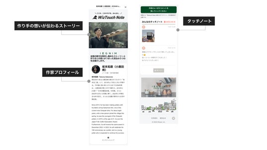 具体的には「WizTouch Note」を通じて、使い手は作り手である作家のストーリーや人柄に直接触れることができ、作り手は作品への想いや制作過程をリアルに届けることが可能です。この特別な場所でしか体験できない新しいコミュニケーションで、民藝の魅力や世界をより身近に感じていただけるサービスとなっています。さらに、IEGNIMの実店舗では、作家の個展やイベント、新作の情報発信を通じて、作家と来店者がつながるコミュニティの形成を目指します。