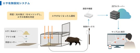 イノシシ捕獲用箱罠に仕掛けたエサの有無を自動検知し、その結果を遠隔地から確認する仕組み。エサの補充のための見回り負荷を軽減します。エサ有無は照度センサーを活用し、照度(光の強さ)を測定することで判定します。