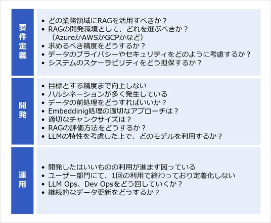 一方で、RAGの導入を進める企業の多くが、導入/開発過程で様々な課題に直面しています。例えば、ハルシネーション(AIが誤った情報を生成する現象)といった「AIが作り出す間違えた回答」により、期待する回答を得られず、それによりユーザーの利用率が低下することなどが挙げられます。さらに、このような課題に直面した際、その解決の糸口を技術的に発見するのに困難な場合が少なくありません。