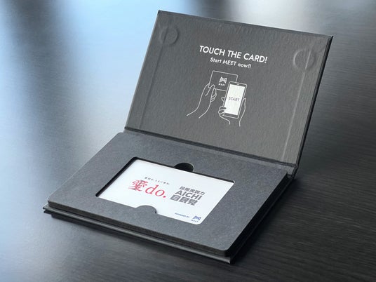「MEET」は、MEET株式会社が独自開発したNFC(近距離無線通信)を活用したコミュニケーションサービスです。スマートフォンを「MEET」にかざすことでWEBサイトやアプリなどのコンテンツに一瞬でアクセスすることができます。そのため、顧客体験におけるオフラインからオンラインに切り替わるようなシーンにおいてとりわけ力を発揮します。また、表示コンテンツは専用アプリでリアルタイムに更新できるため、「MEET」本体を回収することなく、スピーディーな情報発信が可能です。スマホより一回り大きいサイズの大判シートやカード型、ポッティングシール型など様々な形状が用意されている上に、電源・充電が不要なので様々なシーンに利用できます。