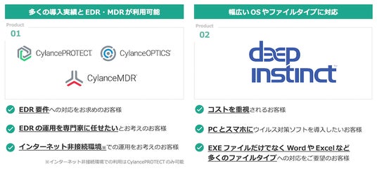 また、「Cylance」については、セキュリティ専門家による24時間365日監視を行うMDRサービス「CylanceMDR」をご提供しています。マルウェアの事前防御からセキュリティ専門家による支援・監視・分析までをオールインワンで提供することで、企業・組織の外部脅威対策の運用をご支援します。