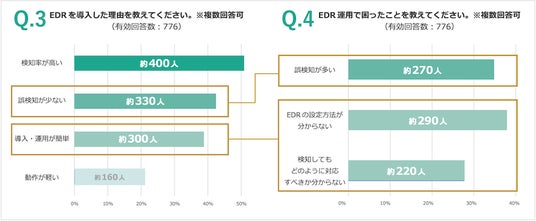 「EDRを導入した理由を教えてください(複数回答可)」という質問には、『検知率が高い(約400人)』と回答した方が最も多く、次いで『誤検知が少ない(約330人)』、『導入・運用が簡単(約300人)』という結果になりました。