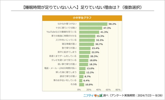 睡眠時間が足りていない人に足りていない理由を聞くと、「なかなか寝つけない」と回答した人が最も多く、小中学生の約6割にのぼりました。「YouTubeなどの動画を見ている」と「スマホをいじっている」がそれぞれ3位と5位で上位にあることから、スマホやSNSなどで脳が刺激を受けていることも寝つけない原因のひとつとなっているのかもしれません。