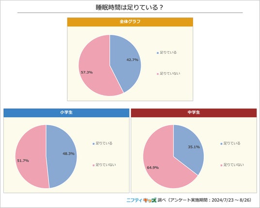 「足りていない」と回答した人は、小学生では51.7%、中学生では64.9%まで増加しました。学年が上がるにつれて部活動や塾などで忙しくなり、睡眠時間が短くなってしまう人が多いようです。