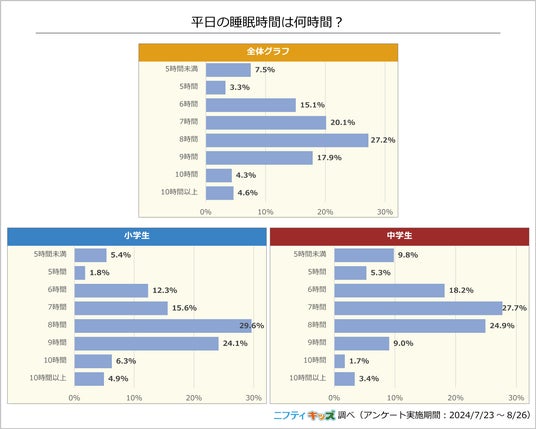 平日の睡眠時間で最も多いのは小学生が「8時間」、中学生では「7時間」で、小学生よりも中学生の方が睡眠時間が短い結果となりました。また、「10時間以上」の睡眠をとっている人は小中学生の1割未満に留まっています。