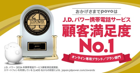 KDDI、沖縄セルラーは、オンライン専用ブランドpovoが、株式会社J.D. パワー ジャパンが実施した「J.D. パワー 2024年携帯電話サービス顧客満足度調査(SM)」(注)のオンライン専用ブランド/プラン部門において、総合満足度1位を受賞したことをお知らせします。