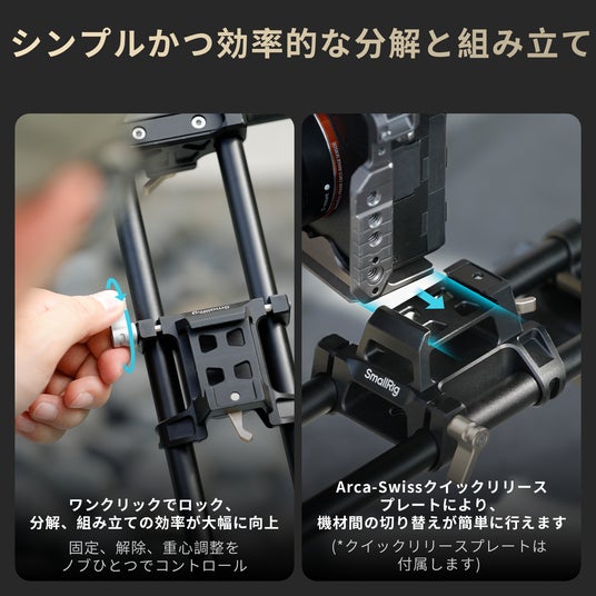 クイックリリースシステムを採用しており、シンプルかつ効率的な分解と組み立てが可能です。固定、解除、位置調整をノブひとつでコントロールできます。Arca-Swissクイックリリースプレートにより、機材間の切り替えが簡単に行えます。