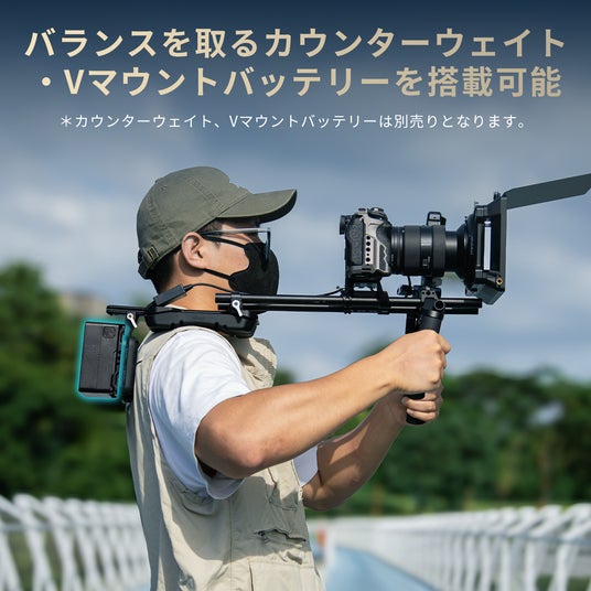 前後のバランスを取るために、カウンターウェイトまたはVマウントバッテリーをリグの後ろに取り付けることができます。