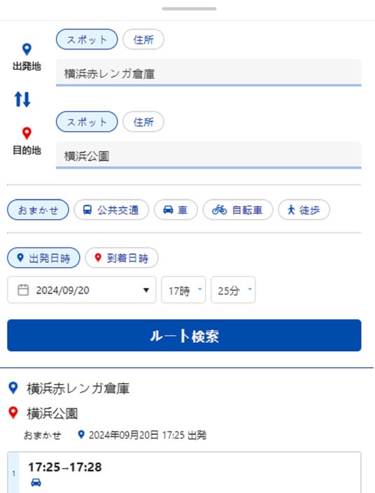 電車・バスに加え、baybike、SEA BASS(海上交通)、YOKOHAMA AIR CABINなどを利用した豊富なルート検索システム!