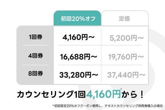 結果を見ると、約95%以上の人が5000円以下でカウンセリングを受けたいと思っていることがわかります。マインドカフェはアプリをダウンロードしてくれた方々にはカウンセリング初回限定20%オフクーポンを配布しており、クーポンを使うと初回最安料金4,160円からとなります。