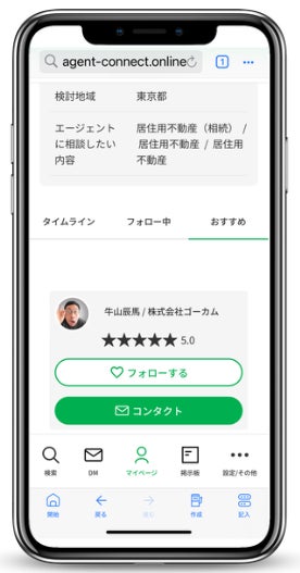 マイページのお知らせタブにオススメのエージェントが表示されるようになりました。ユーザーの相談事、検討エリアに適合した不動産エージェントが表示されることで、迅速にマッチング。不動産エージェントとユーザーを効率的に繋ぎます。