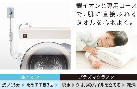 同梱の「銀イオンホース」と併用することで、肌に触れるタオルのニオイを抑えて、たっぷりの水ですすぐことでふんわりと仕上げる「タオルコース」をオリジナルコースとして搭載。銀イオンホースの銀イオンが入った水で洗濯とすすぎをすることでニオイを抑制し、乾燥前の脱水工程時のプラズマクラスター放出と特別な制御によりタオルのパイルを立てるので乾燥後にふんわりと仕上げます。