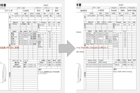 「言語変換(AI)」メニューを追加し、縫製仕様書の中に記入している「文章」や「単語」を翻訳することができるようになりました。