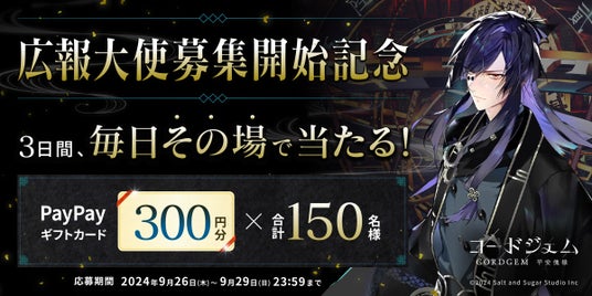 Salt and Sugar Studio(本社:東京都渋谷区、代表取締役:佐野哲也) は、ゲームと音楽のプロジェクト『コードジェム』で、本作品を熱意を持って一緒に盛り上げてくれる「広報大使」の募集を開始しました。