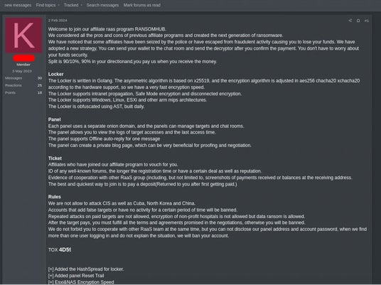 実例として、“Cicada3301”というニックネームのハッカーが、ロシア語の非公開のアンダーグラウンドフォーラム上に、RaaSを提供する新チームの発足を告知する広告を投稿したケースがあります。見返りとして要求したのは、攻撃が成功した場合の手数料20%だけでした。これは、RaaSを提供するサイバー犯罪者が協力者を募る方法と、一般的な収益配分の内訳を示す一例です。注目すべき点として、一部のフォーラムでは、当事者間で報酬の支払いやサービス提供に関する見解の相違が生じた場合に対応するため、調停および紛争解決のための体制が整えられています。このような仕組みは、匿名の環境下でコミュニケーションを取る犯罪者同士にとって不可欠な要素となっています。