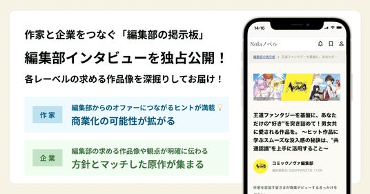 作家と企業をつなぐ創作プラットフォーム「Nola(ノラ)https://nola-novel.com/ (※1)」を運営する株式会社indent(本社:東京都千代田区、代表取締役社長:釜形勇気 以下、「indent」)は、このたびNolaプラットフォーム内に、各企業の編集部が求める作品像を掲載し、作品を常設募集できる「編集部の掲示板」機能に、作家が募集作品の解像度を高め、作品の商業起用に向けたマッチングを促進するコンテンツとして、2024年9月27日(金)より順次、各レーベルの「独占インタビュー」を公開することをお知らせいたします。