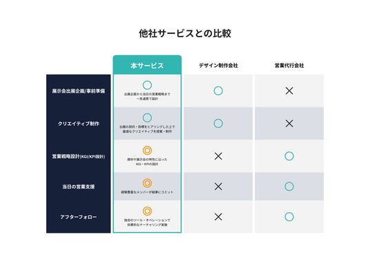 本サービスでは、展示会出展において、これまでの展示会支援での成功体験のノウハウを活かし、最適な戦略設計と圧倒的な実行力で展示会マーケティングを新しい一つの収益の柱にいたします。