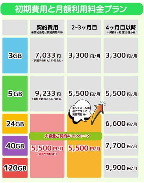 大容量プランご契約キャンペーン特典として、24GB・40GB・120GBの大容量プラン限定で、事務手数料3,733円(税込)が無料&2ヶ月目・3ヶ月目のプラン料金が一律5,500円(税込)でご利用いただけます。
