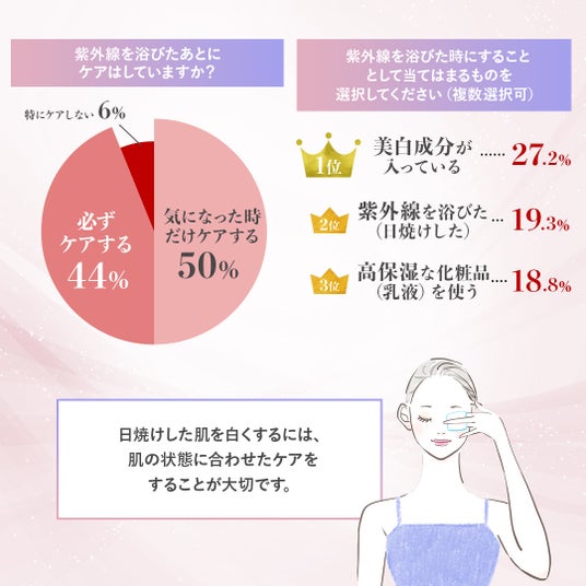 また、約4割の方は「紫外線を浴びたあとに必ずケアする」と回答し、ケア方法としては「美白成分が入っている化粧品を塗る」という回答が最も多い結果となりました。日焼けあとのケアは、肌の状態に合わせて肌を冷やすなどのケアを行うことがおすすめです。