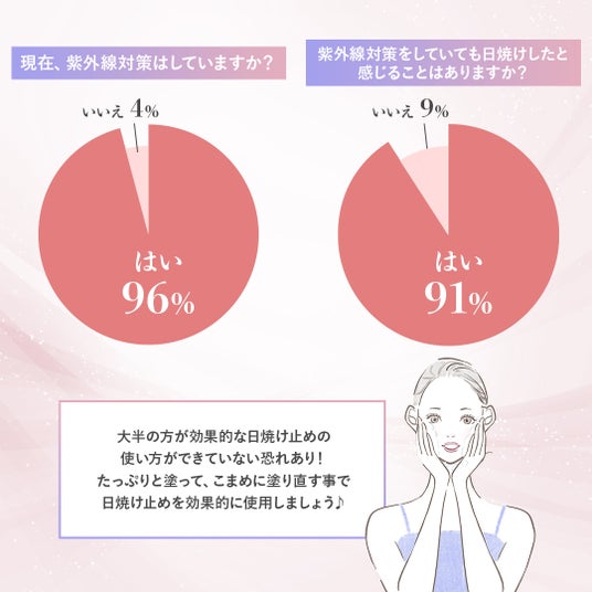 日焼けあとに関する意識調査の結果、9割以上の方が「紫外線対策を行っている」と判明しました。また、9割の方が紫外線対策をしていても日焼けしたと感じた経験があり、正しい紫外線対策を行えていない可能性があります。