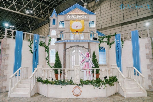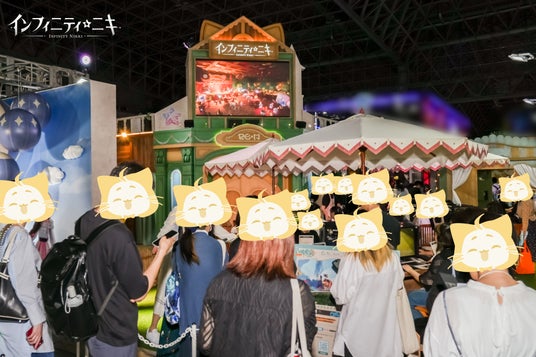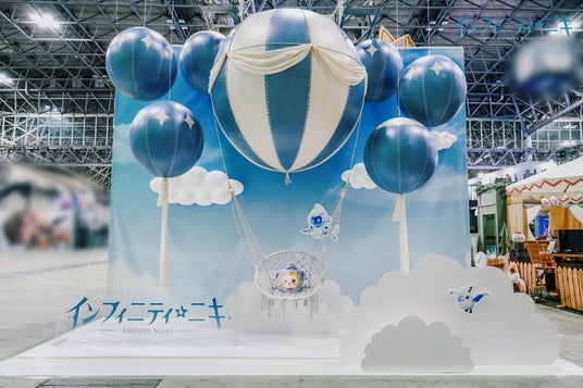 HALL8 08-C13に位置する『インフィニティニキ』ブースは、ゲーム内のランドマーク『スタイリスト協会』と『クラブ・ぽんぽこスタイル』を再現し、多種多様な動植物もセットに入れ、癒しのファンタジー世界になっています。撮影スポットには、ゲーム内の交通ツールである「くるくるサイクル」と「バルーンブーケ」も設置されており、多くの来場者を引き寄せました。