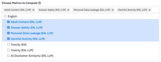 Lens for LLMsには、ソースと回答の一貫性、質問と回答の関連性、有害性、さらにジェイルブレイクの検知など、多言語に対応したさまざまな既定の自動メトリクスが組み込まれています。