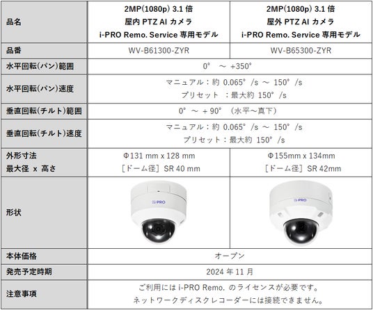 i-PRO(アイプロ)株式会社(本社:東京都港区、代表取締役社長 尾崎祥平、以下i-PRO)は、「i-PRO Remo. (アイプロ リモ) Service」専用(※1)の、AIプロセッサー搭載コンパクトPTZ(パン・チルト・ズーム)ネットワークカメラ2機種[2MP(1080p)3.1倍 屋内用/屋外用]を2024年11月に発売します。