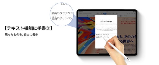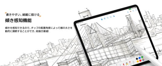傾き感知機能を搭載し、ペンの角度に応じて線の太さを簡単に調整可能。特にイラストや図解を描く際に、微細な表現をリアルに再現できます。また、Bluetooth接続不要で、タッチペンの上部を軽くタップするだけで電源をオン/オフできる簡単操作も魅力です。