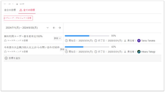 ワークスペース、プロジェクト、個人の単位で目標を設定し、目標の進捗を組織のメンバーに共有できます。メンバーは目標に沿って自分のタスクを遂行すればよいため、メンバー間の認識のずれを防止します。
